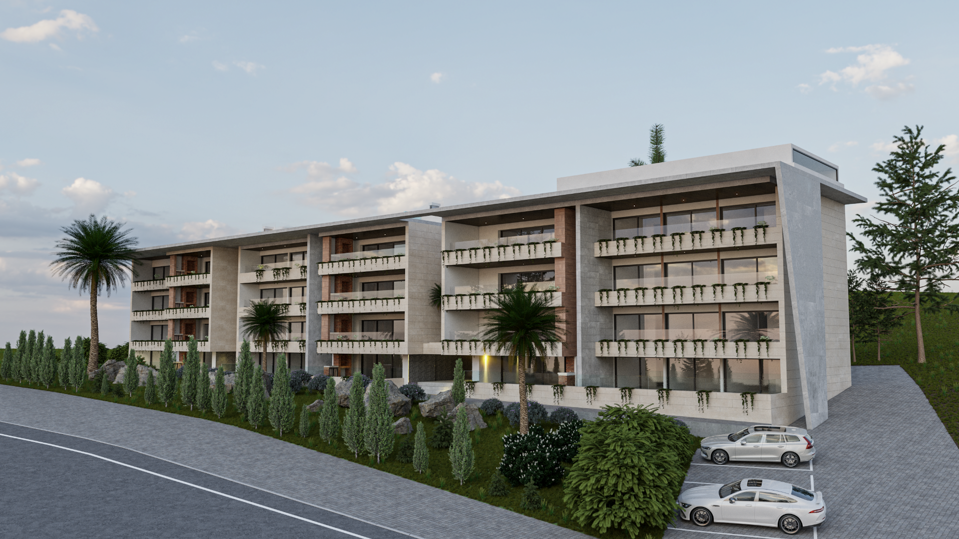 Ritmo das Varandas: O desenho das varandas não é apenas funcional; estas são desenhadas com avanços e recuos que criam um jogo de sombras e garantem a privacidade entre vizinhos, sem comprometer a panorâmica de 180°.